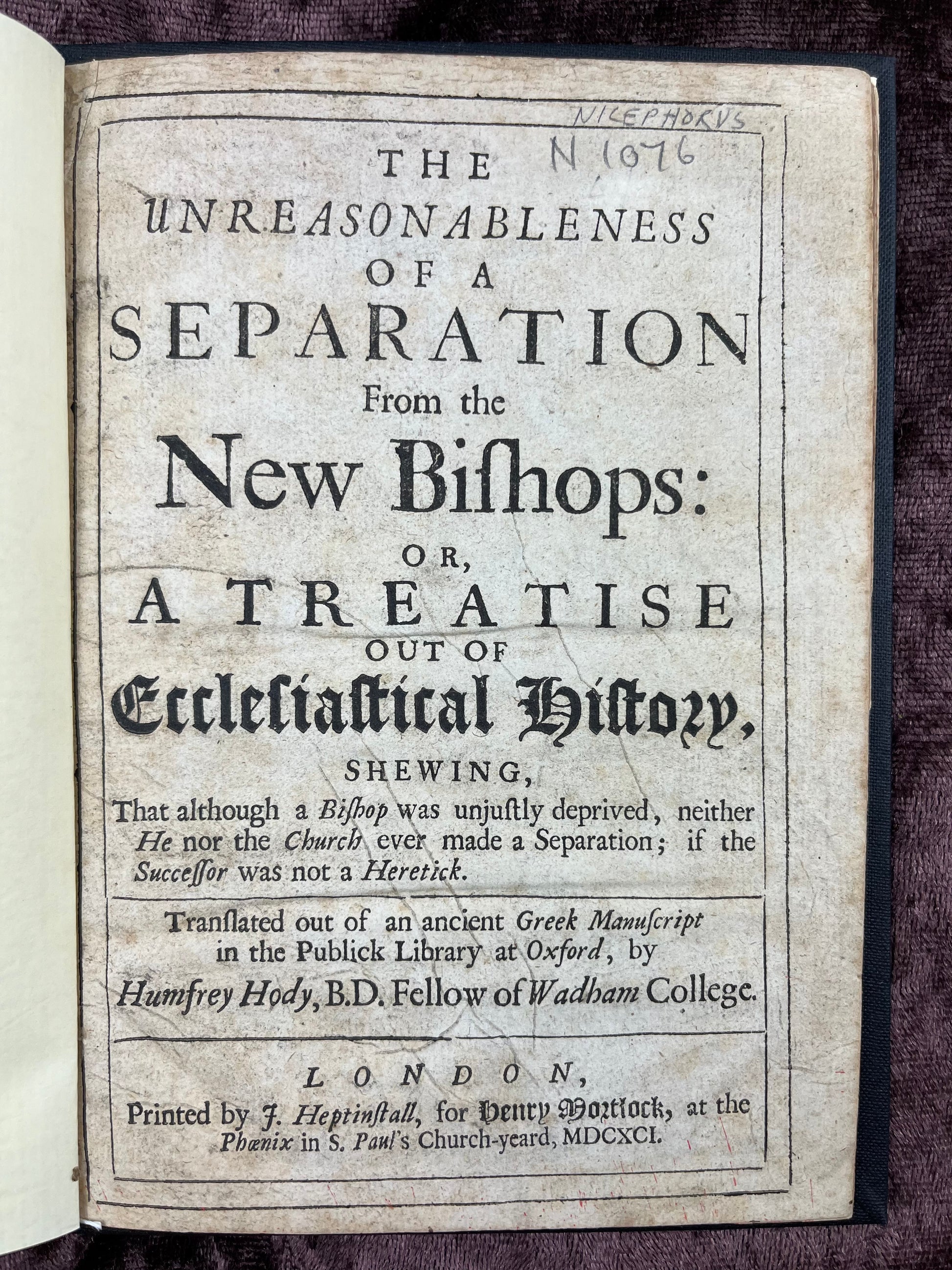 1691 Quarto Pamphlet The Unreasonableness Of A Separation From The New Bishops Or A Treatise Out Of Ecclesiastical History By Humfrey Hody